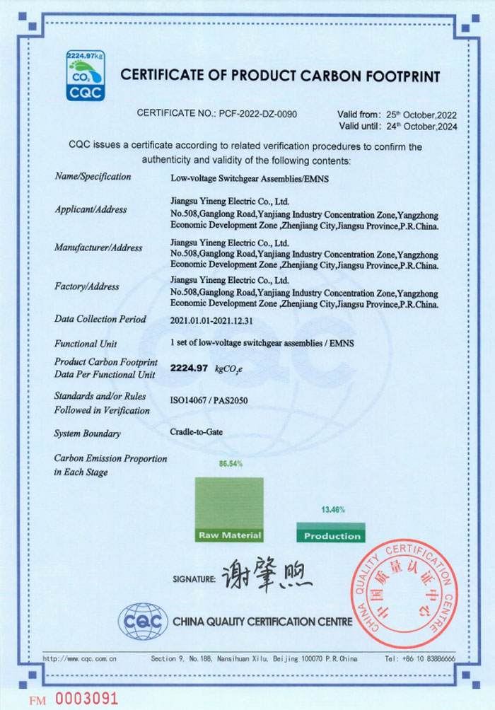 EMNS低压柜碳足迹证书