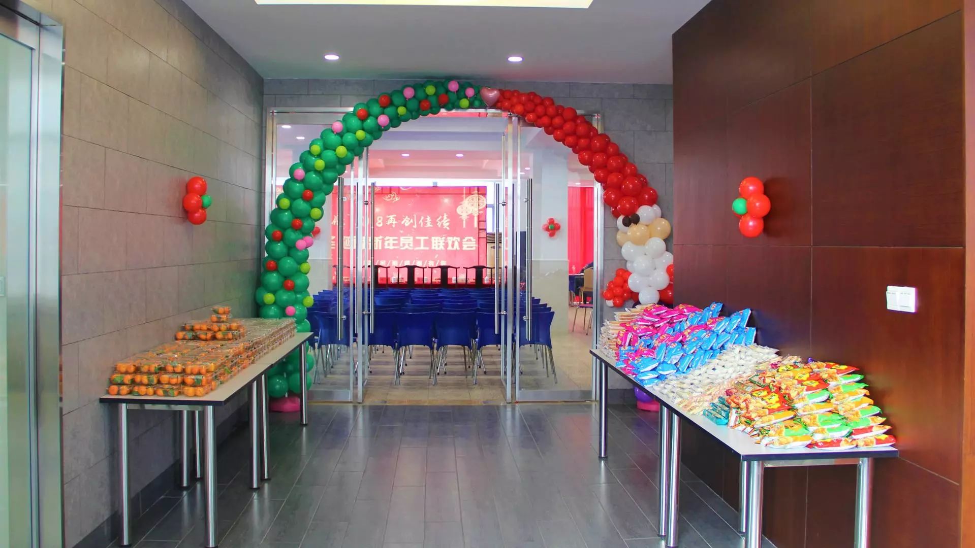 ▲集团工会精心准备了圣诞主题的气球拱门 并为每一位员工准备了美味的水果、零食。
