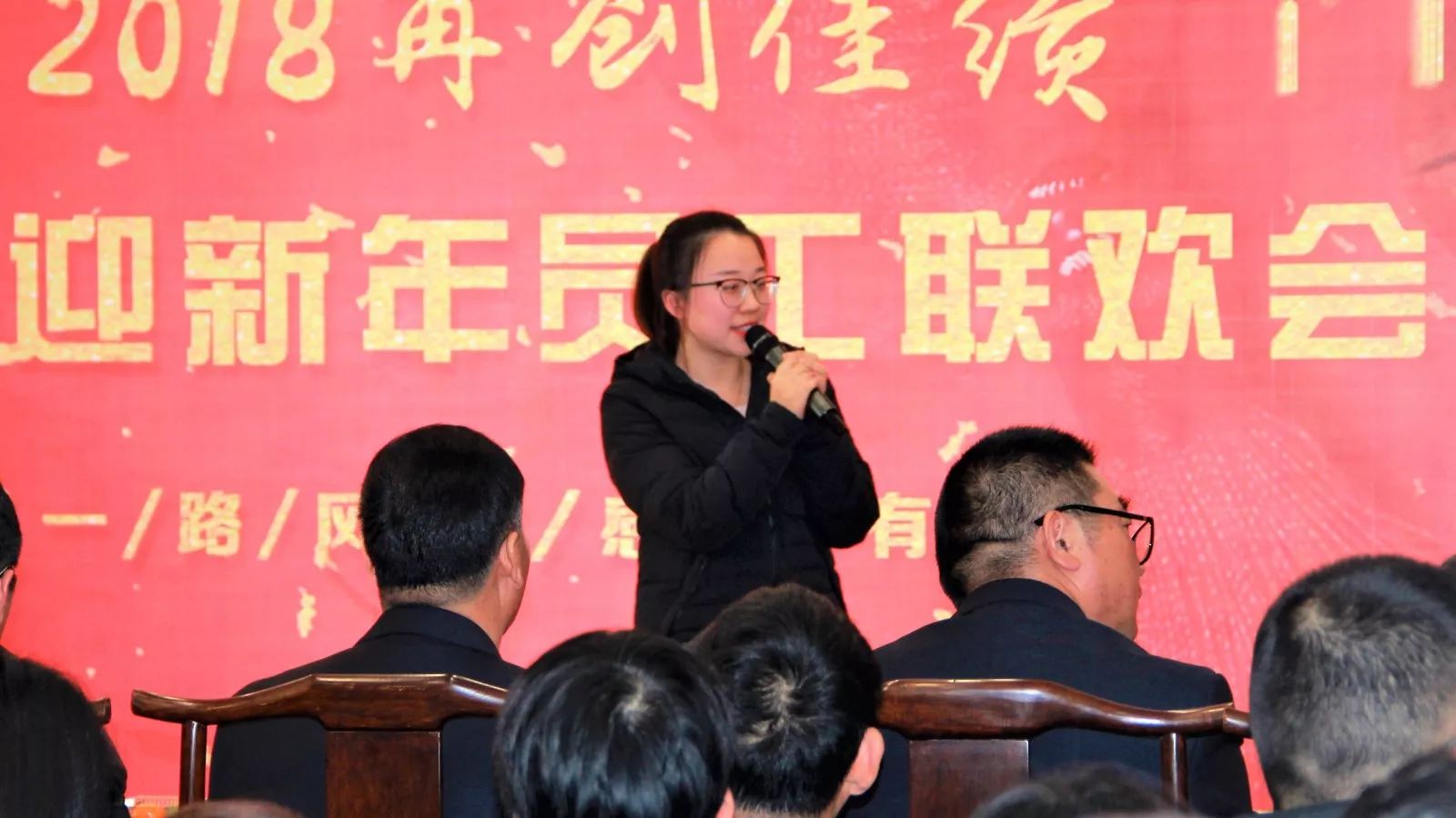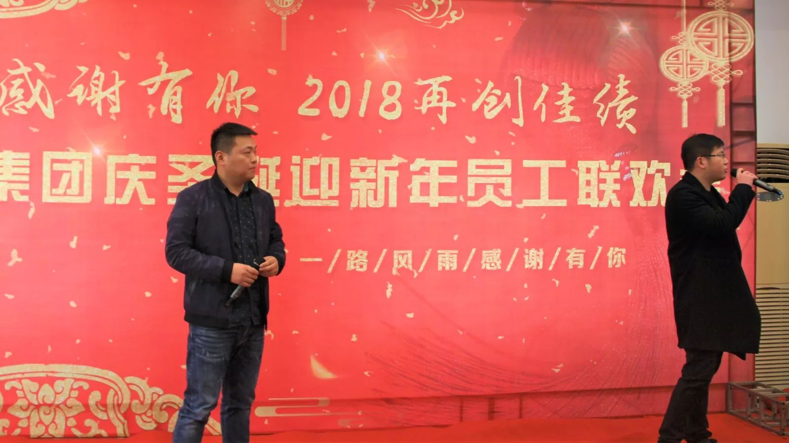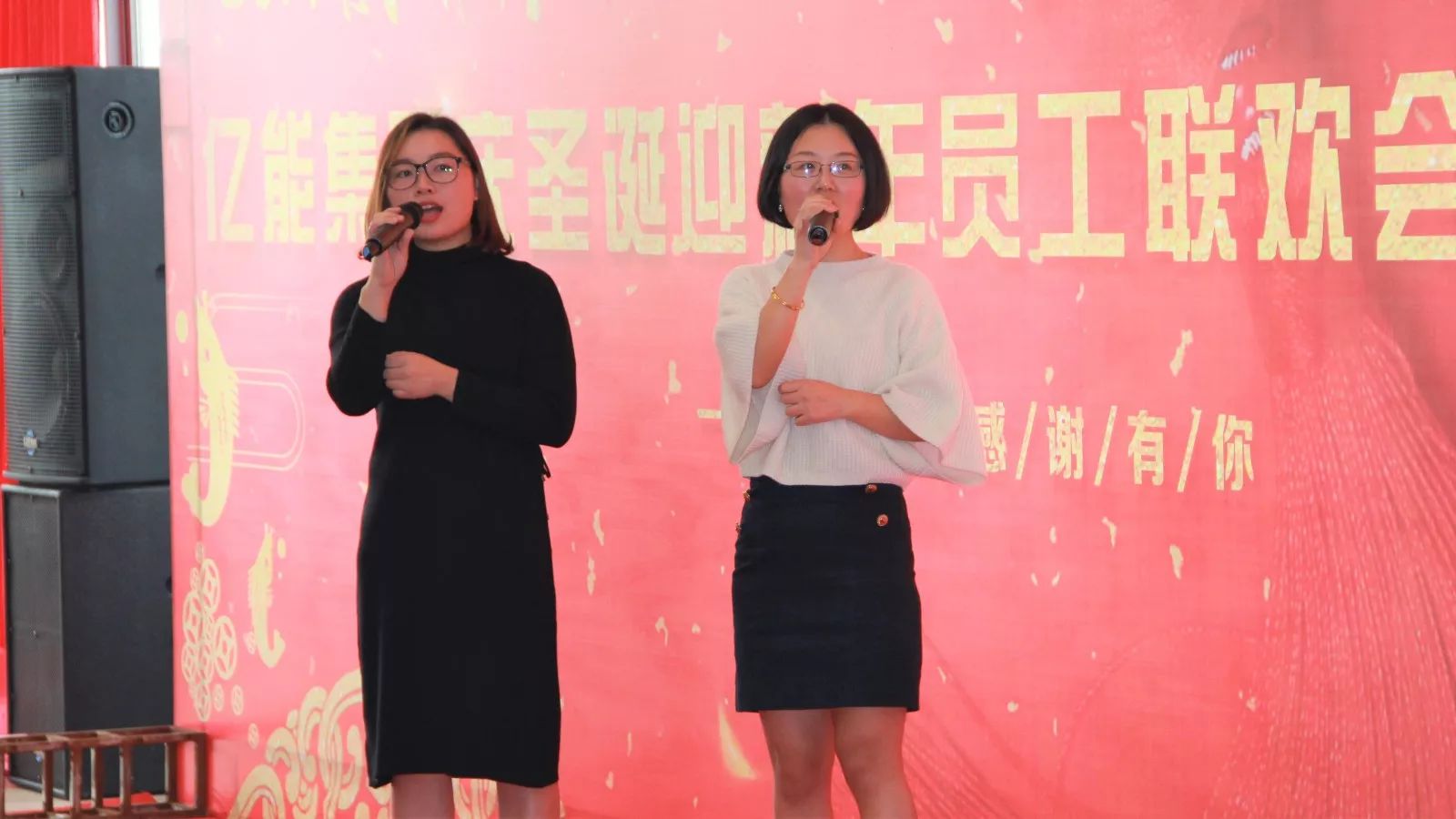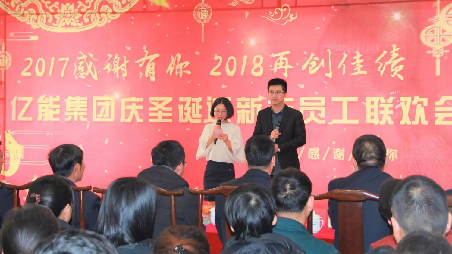 ▲主持人佘小程、谈博介绍联欢会节目 亿能员工济济一堂,欢声笑语,共度佳节。