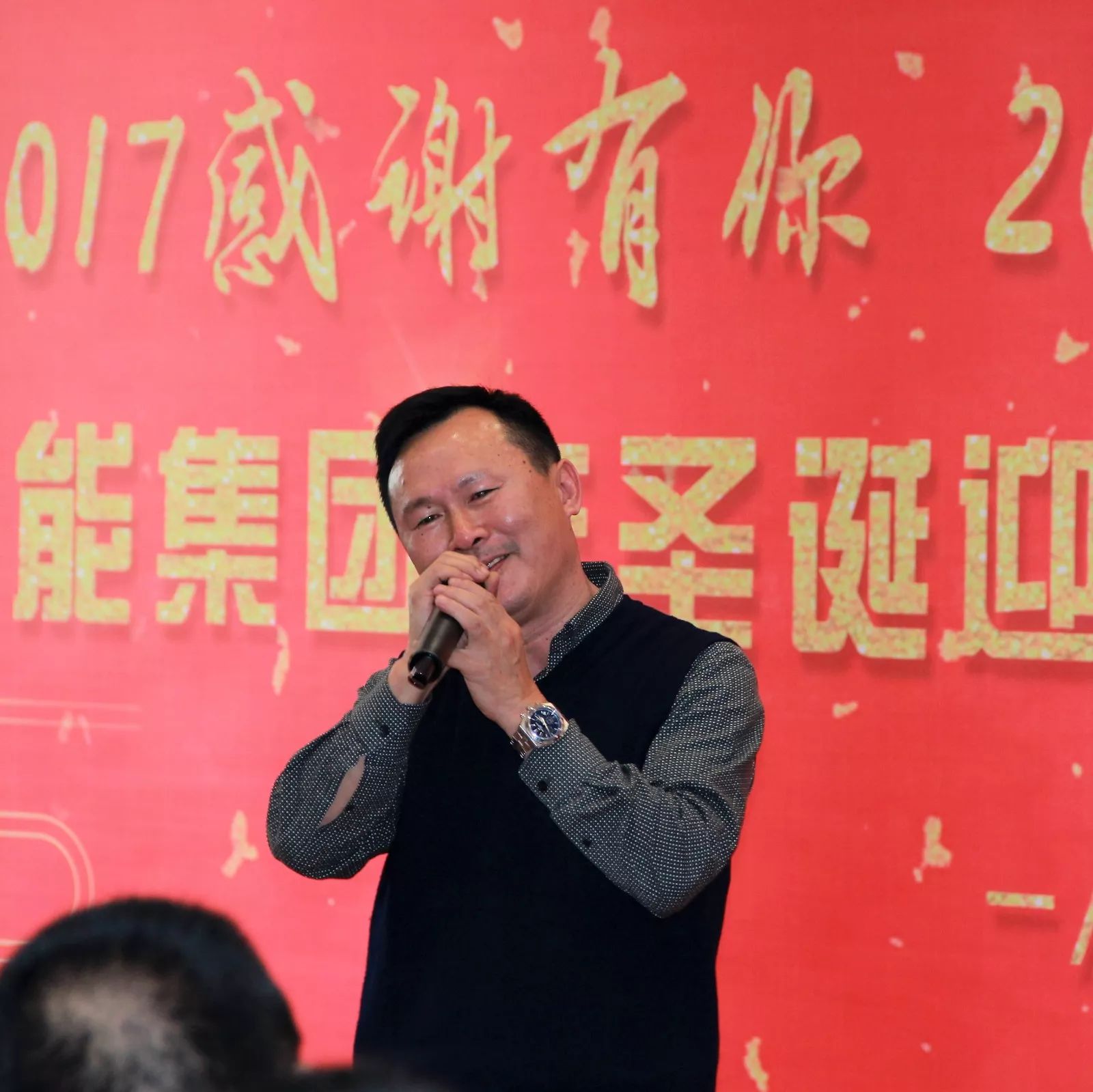 ▲亿能集团董事长周桂根献歌 一曲《为了谁》高音震撼,动听洪亮,将气氛推向高潮。